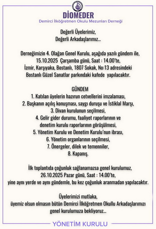 belirtilen yerde toplanacak olan olağan genel kurulumuza derneğimizin üyelerini mutlaka,